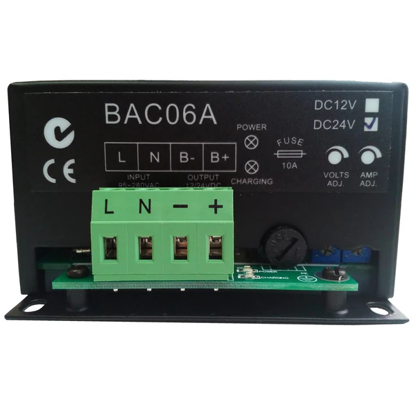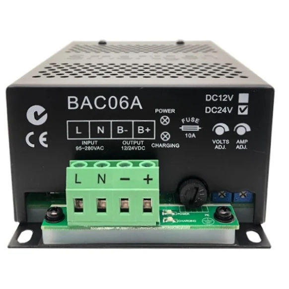 The BAC06A-12V is a switching power supply type battery charger designed specifically for lead-acid batteries in generator sets. It features a multi-stage charging process (constant current followed by constant voltage) to ensure that batteries are charged quickly and safely without overcharging. The charger is highly efficient and includes protection against short circuits, reverse polarity, and over-current. Its compact design allows for easy mounting within the generator control panel. This intelligent charger extends the lifespan of the battery and ensures the generator is always ready to start in emergency situations.